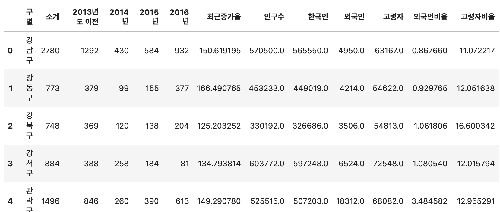 이번 글에서는 인구 데이터프레임과 CCTV 데이터프레임을 가지고 외국인과 고령자의 수가 많으면 구별 CCTV가 많은지 보는 실습을 해보겠습니다. 여기서 적절하다의 기준은 인구를 기준으로 하겠습니다.