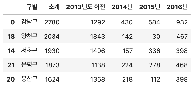위 코드는 CCTV 데이터프레임 중 소계라는 컬럼을 내림차순으로 정렬하여 상위 5개 데이터를 출력하라는 뜻입니다.