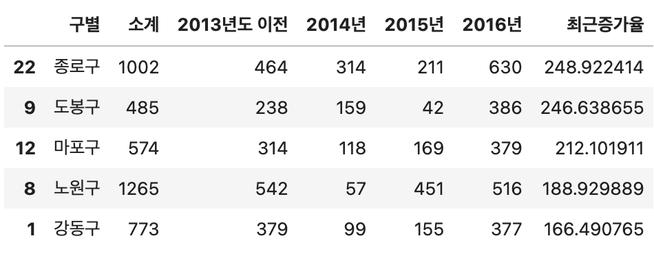 위 코드를 통해 강남구에 CCTV가 2780개로 가장 많이 설치된 것을 확인할 수 있습니다. 하지만 절대적인 숫자를 통해서는 CCTV가 많은지 적은지 알 수 없기 때문에 최근 증가율이라는 새로운 컬럼을 통해 얼마나 증가했는지를 알 수 있게 컬럼을 추가하겠습니다.