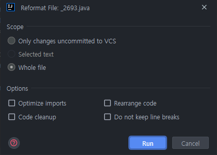 단축키를 누르면 다음과 같은 창이 뜬다. Run을 클릭하면 코드가 자동 정렬되어 보기 편해진다.