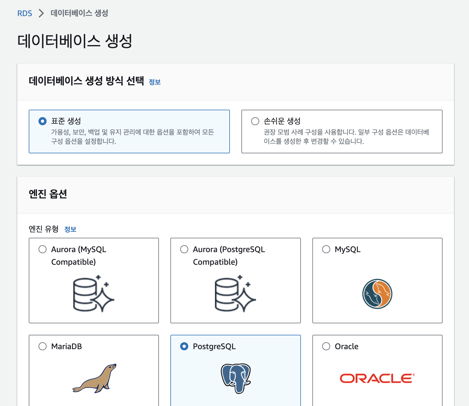 RDS 또한 다음과 같이 MySQL, Oracle, MariaDB 등 다양한 엔진을 지원합니다.