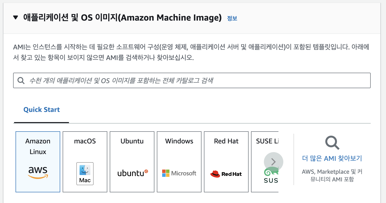사진에 나온 것처럼 Linux, mac OS, Ubuntu, Windows 등 다양한 운영체제로 인스턴스를 실행할 수 있습니다.