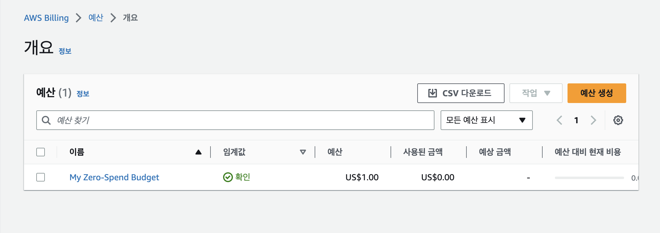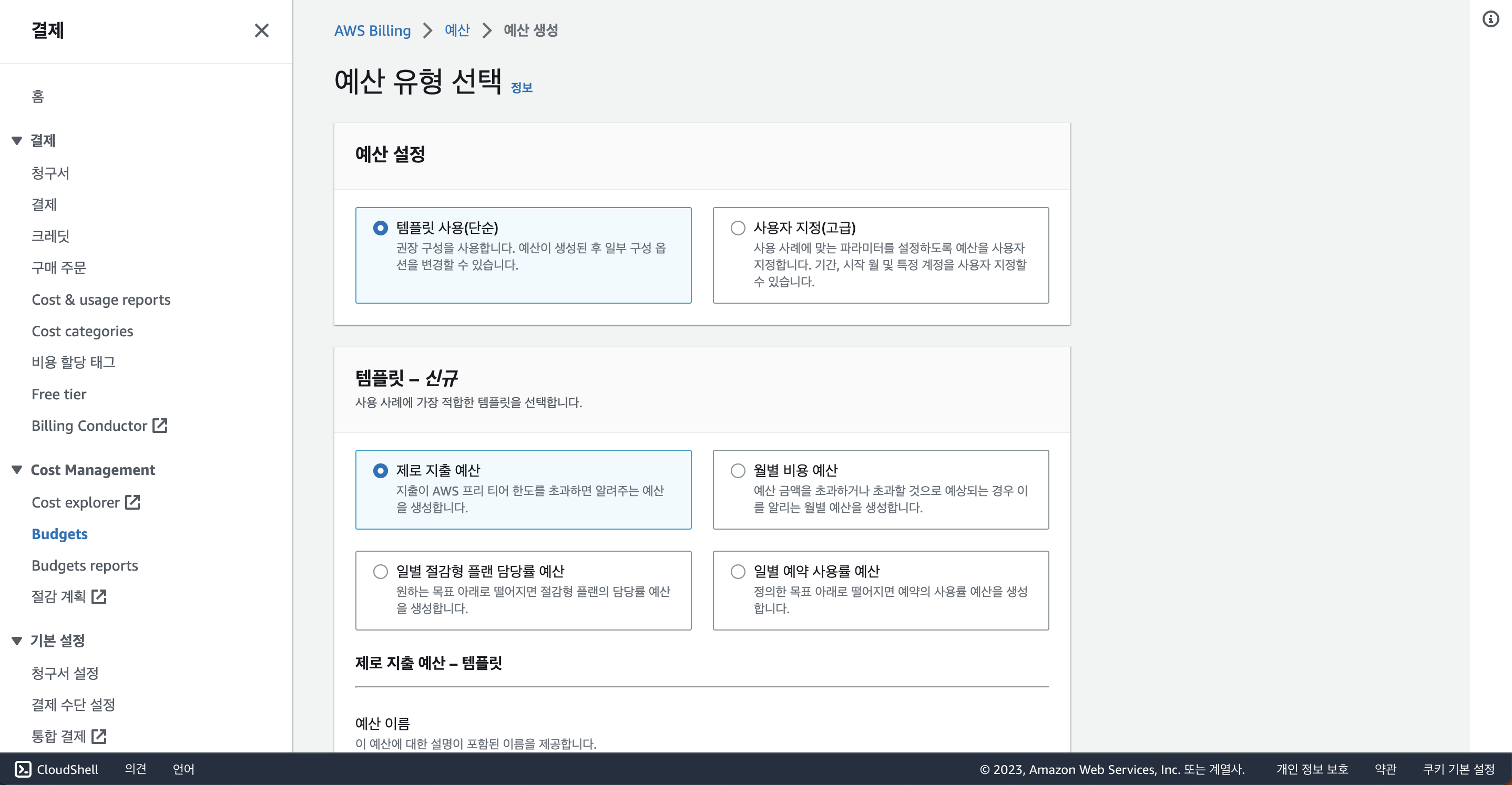 이렇게 "제로 지출 예산"이라는 템플릿을 선택할 수 있답니다. 이걸 선택하면 프리티어 한도를 초과할 때 즉시 연락이 가게 되니, AWS에서 사용하는 금액을 관리하기에 훨씬 편리하겠죠?