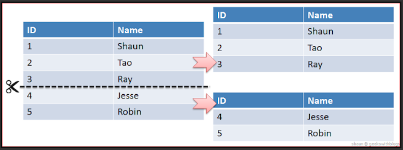 ์ด๋ธ ์คํค๋ง๋ฅผ ๊ฐ์ง ๋ฐ์ดํฐ๋ฅผ ๋ค์์ ๋ฐ์ดํฐ๋ฒ ์ด์ค์ ๋ถ์ฐํ์ฌ ์ ์ฅํ๋ ๋ฐฉ๋ฒ. ํ