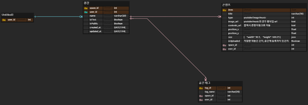 space에 여러 개의 tag를 설정할 수 있는 기능도 존재하는데, tag는 space와 별도로 존재할 수 있으므로, 이 또한 Non-Identifying Relationship(비식별관계)로 설정하였다.