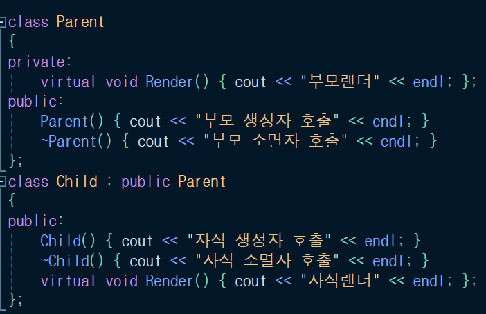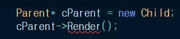 - 함수에 virtual 선언을 했고, 함수 이름이 같고, 매개변수가 같아야 오버라이딩이 된다.