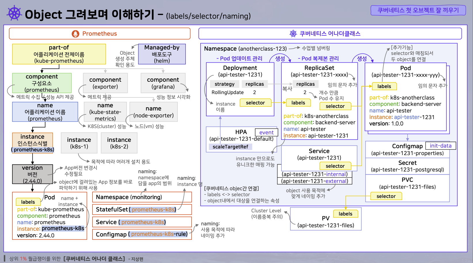 name: 정확한 대상을 지정 (유일)label: 속성 태그 (여러 개 가능, 선택 조건이 됨)selector: label을 기준으로 오브젝트 그룹 연결인프런 : 쿠버네티스 어나더 클래스 - 지상편