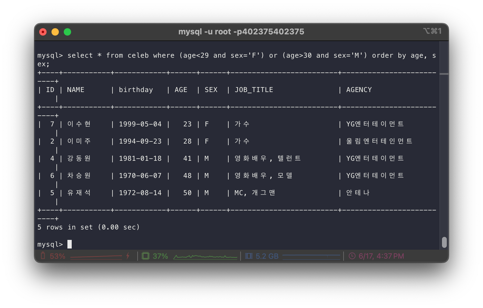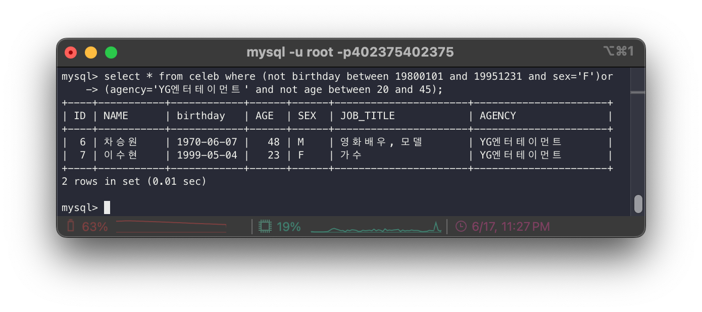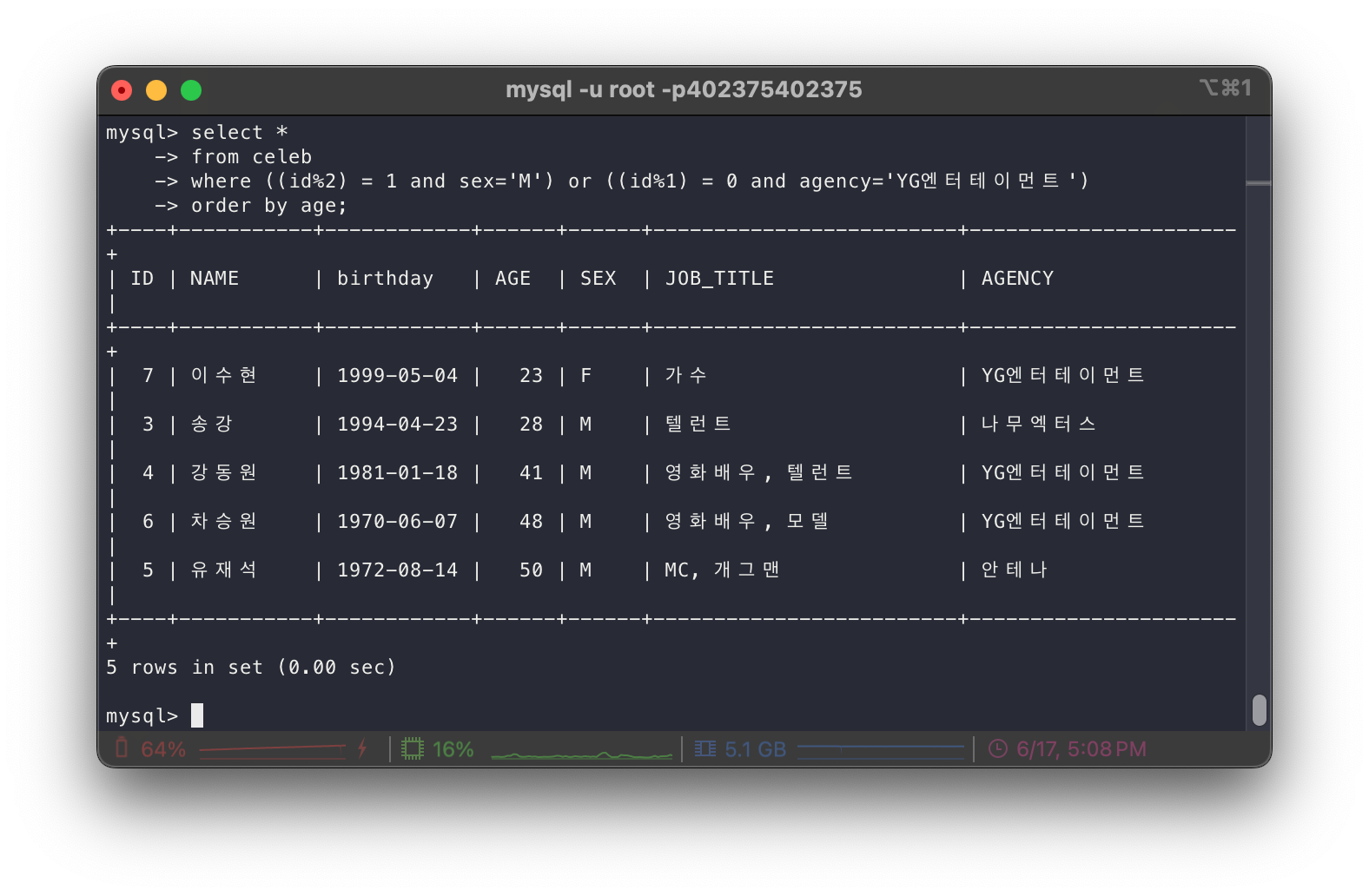 (3) Celeb 테이블에서 아이디가 홀수면서 성별이 남자거나, 아이디가 짝수면서 소속사가 YG엔터테이먼트인 데이터를 나이순으로 정렬하여 검색