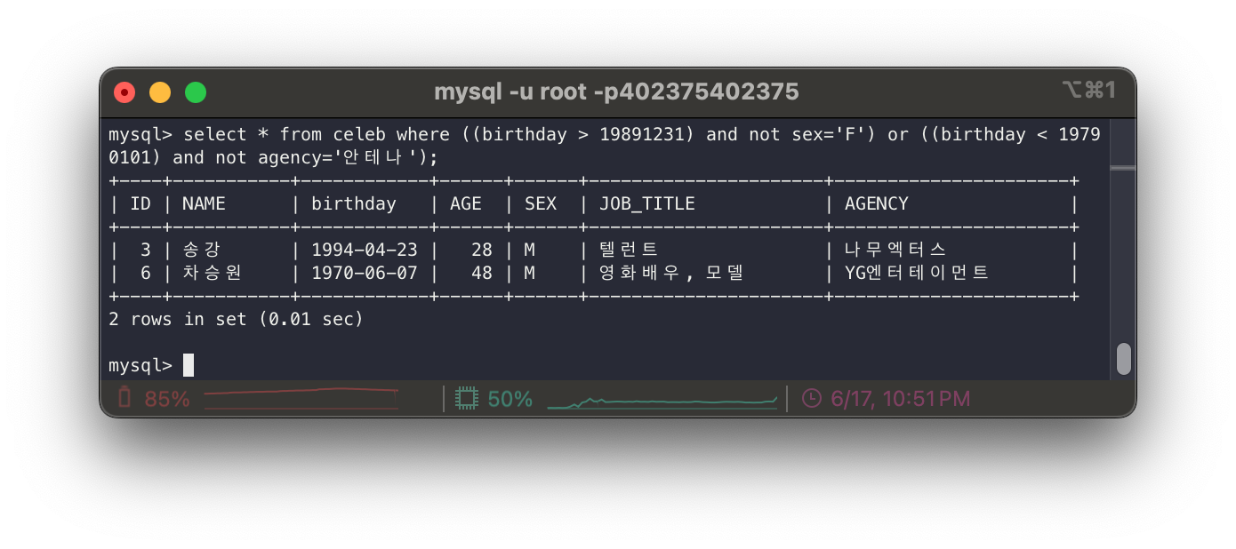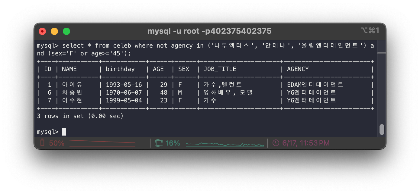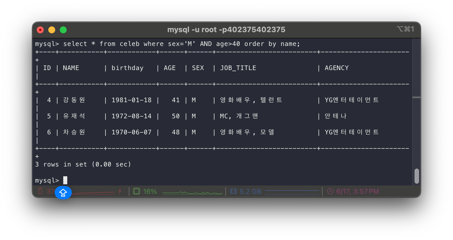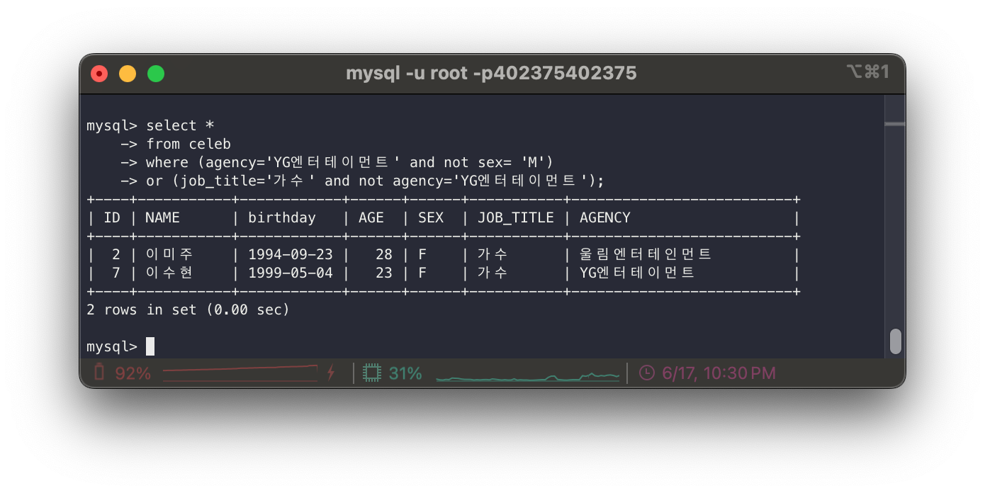 (3) Celeb 테이블에서 아이디가 홀수면서 성별이 남자거나, 아이디가 짝수면서 소속사가 YG엔터테이먼트인 데이터를 나이순으로 정렬하여 검색