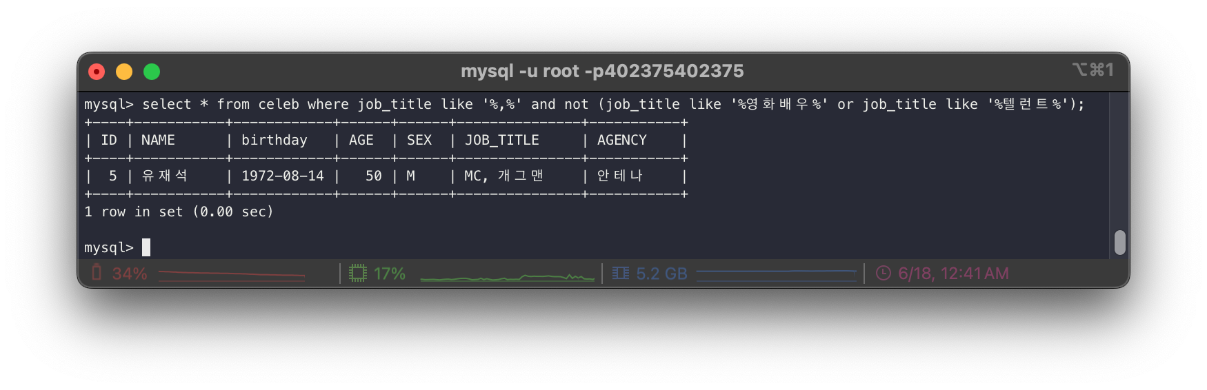 | ‘%가수%’ | ‘가수’가 포함되어 있는 패턴 |