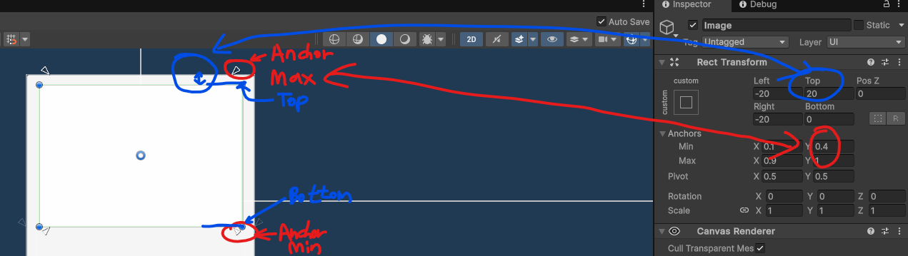 즉 우리의 캔버스 내부에 특정한 범위내에서 유동적으로 크기 조절을 하기 위해서는, Anchors값을 같지않게 조정해주고, 이에 대해 Top과 Bottom으로 부터 얼마나 떨어질지 offset을 정해주면 된다.