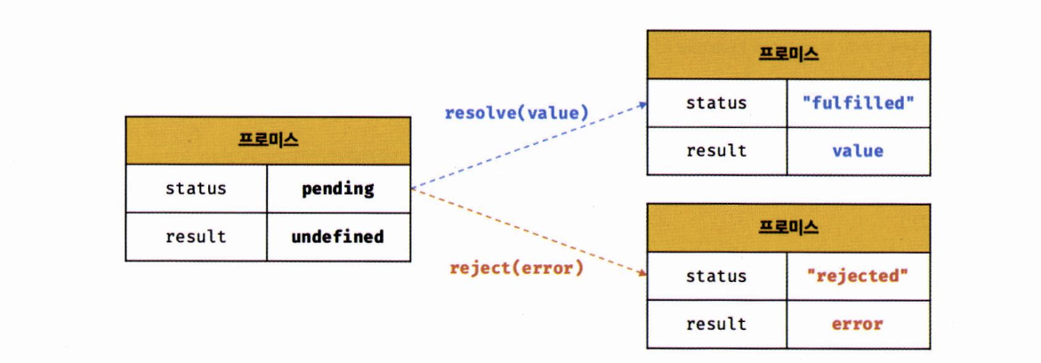 resolve 함수를 호출해 프로미스를 fulfilled 상태로 변경한다.reject 함수를 호출해 프로미스를 rejected 상태로 변경한다. 즉, 프로미스의 상태는 resolve 또는 reject 함수를 호출하는 것으로 결정된다.