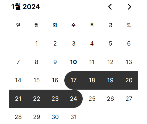 기존 --rdp-accent-color 색상은 파란색이며 날짜 범위에 색칠되는 색상이다. 나의 경우는 검정에 가까운 색상으로 변경해주었다.