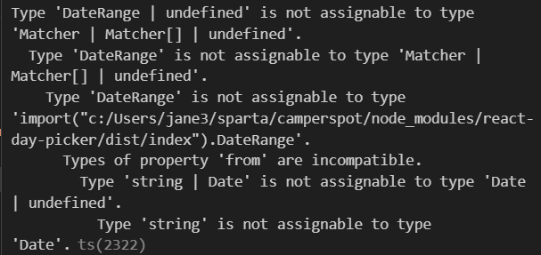 react-day-picker에서 날짜 범위를 명시하는 타입이 지정되어 있어 import하여 타입으로 지정해주면 된다. setRange는 undefined인 경우도 있어 유니언 타입으로 undefined를 지정해주니 오류 해결!