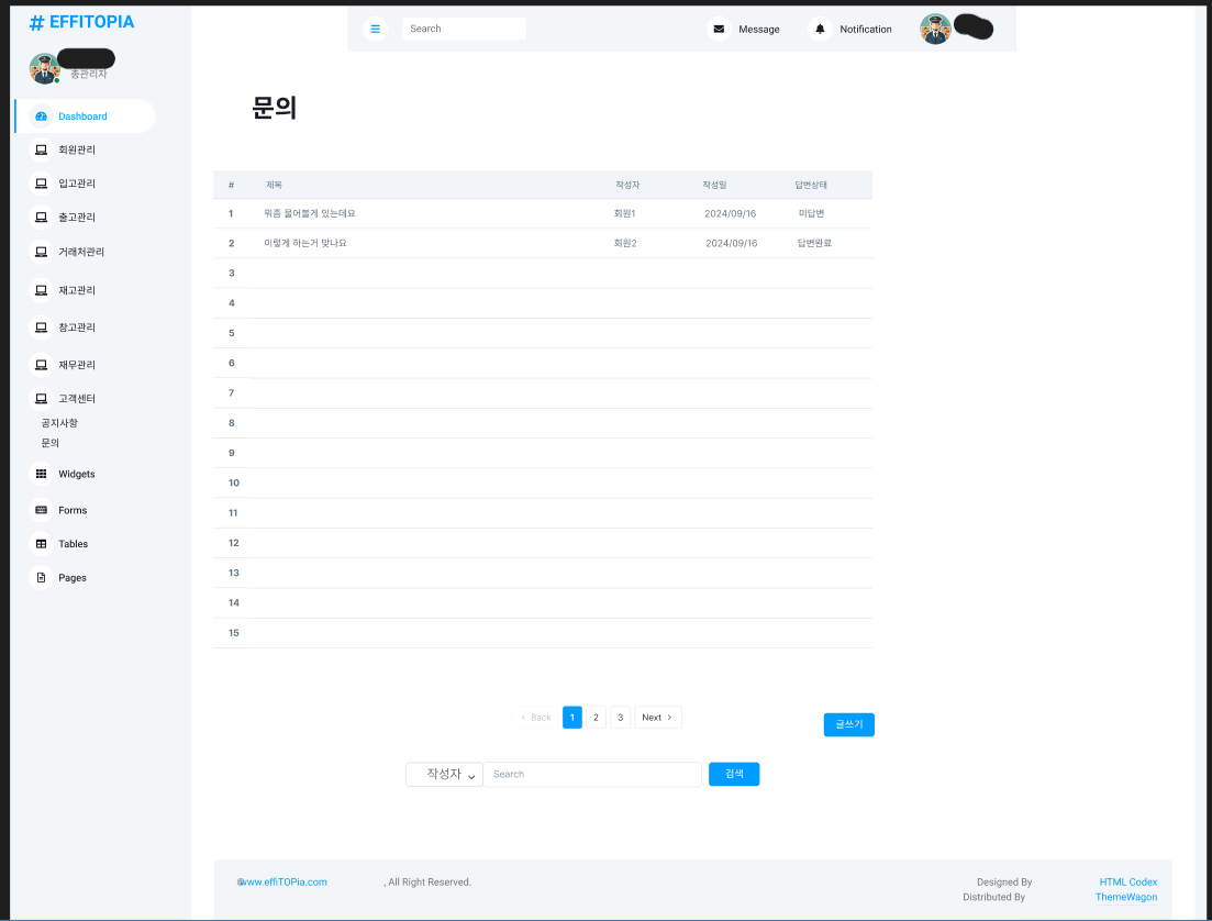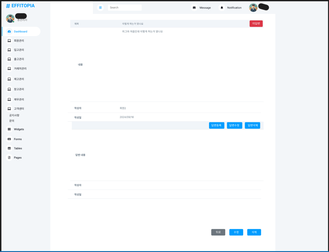 - 공지사항 : 총 관리자만이 CUD 할 수 있는 기능으로 총관리자를 제외한 나머지 유저들은 R만 가능하다. 이 프로그램을 사용하는 모든 사람에게 알리는 글을 작성 하여 띄운다. (공지사항은 문의와 유사한것이 많아서 이번에는 제외)