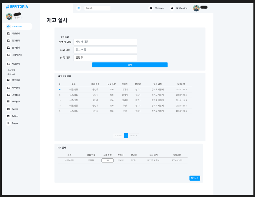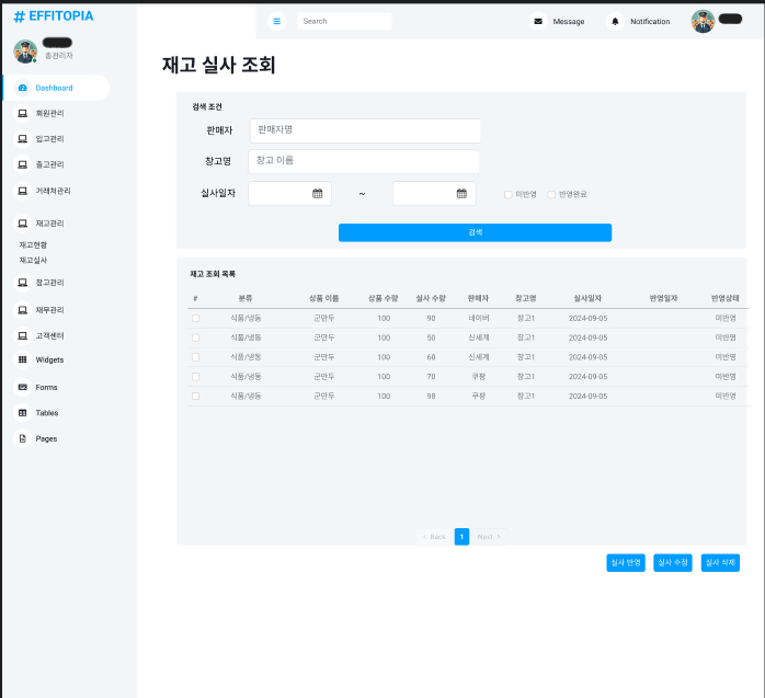 - 재고 실사 등록 : 창고 명, 상품 명, 재고 수량 등 직접 입력하여 실사 값을 작성
