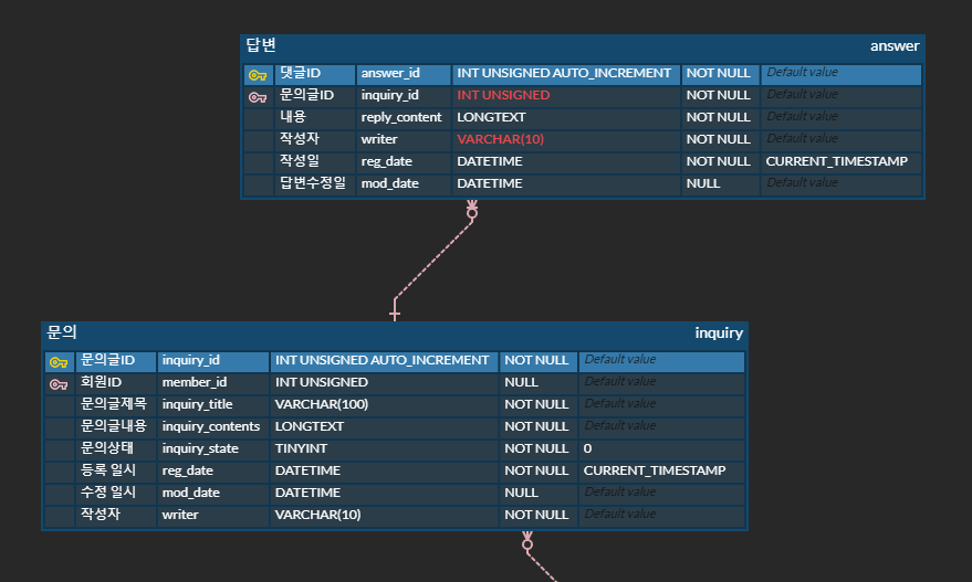 - 문의 : 회원이 CRUD를 할 수 있는 기능으로 모든 회원이 모든 문의글을 CRUD를 할 수 있는 것은 아니고 자신이 작성한 글 한정으로 CRUD가 가능하다. 다만 총관리자는 모든 문의글을 수정 및 삭제가 가능하다.