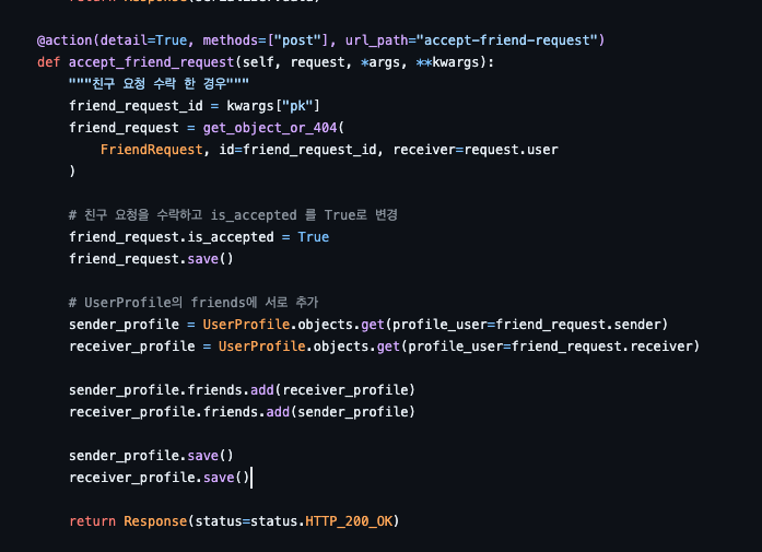 그래서 고민 했던 점이 프로필에서 action을 써서 마이 페이지를 구성 할지, 새로운 APIView 클래스를 만들지 고민했고 무분별한 action 보다는 하나의 깔끔한 뷰가 나을 것 같다는 판단 하에 뷰를 만들었다.