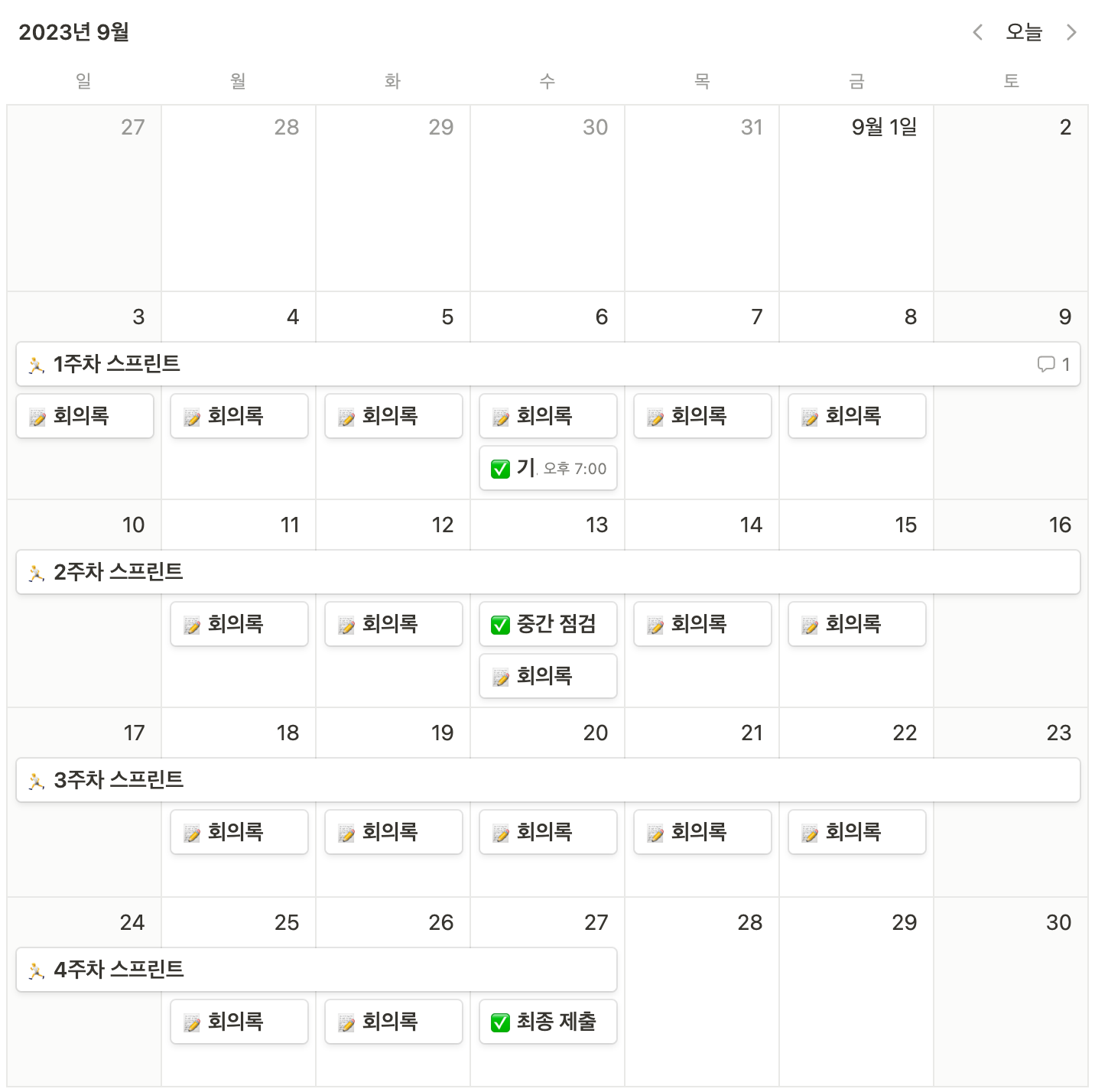 초반 기획 때 주차 별 스프린트 목표를 세우고 시작했다. 회고를 진행하며 유동적으로 목표를 재설정해나갔다.