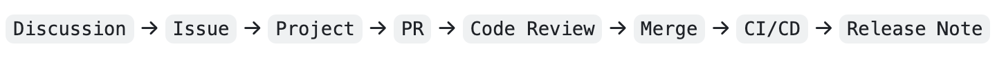 discussion으로 project에서 issue를 발행하고 작업을 한 뒤에 pr을 올린다. code review 후에 2명 이상의 approve를 받으면 merge 할 수 있다.