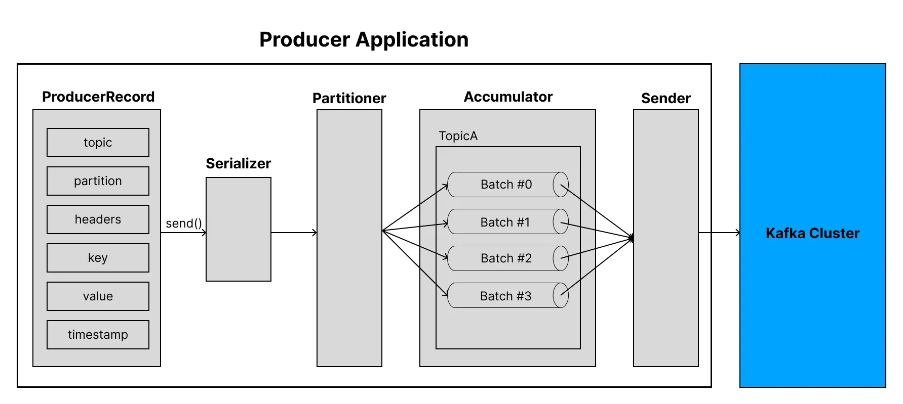 • Producer는 메시지를 직렬화·파티셔닝한 뒤 Accumulator의 Topic별 버퍼에 저장한다.