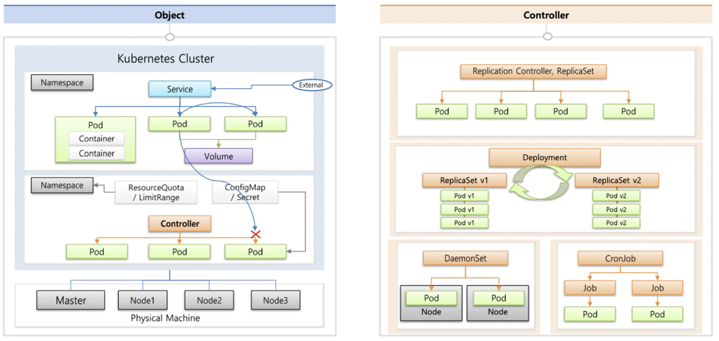 쿠버네티스 클러스터는 크게 Object와 Controller로 나눌 수 있다.