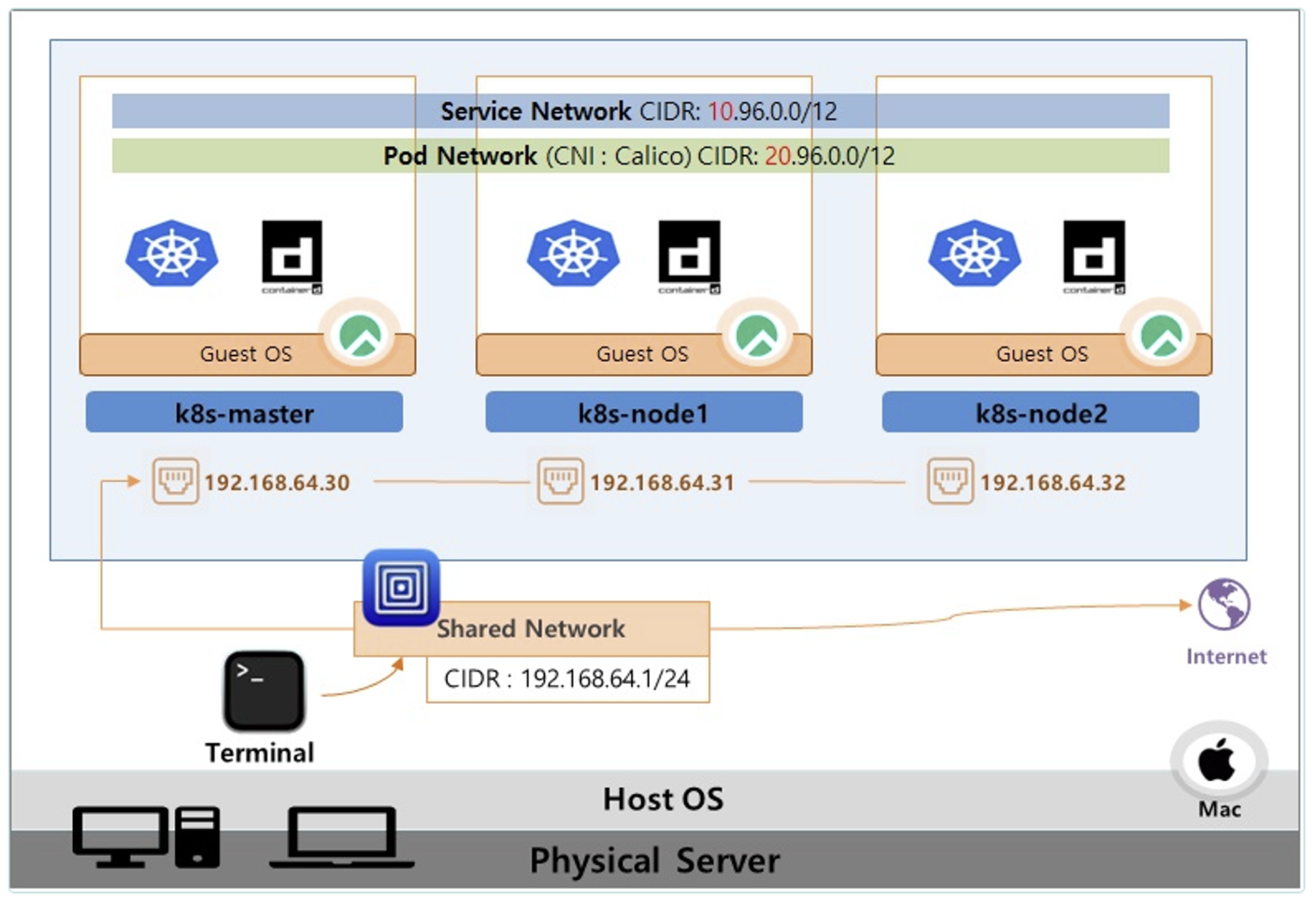 이 그림은 MacOS 환경에서 가상 머신을 이용해 쿠버네티스 클러스터를 구성할 때의 네트워크 구조를 나타낸다.