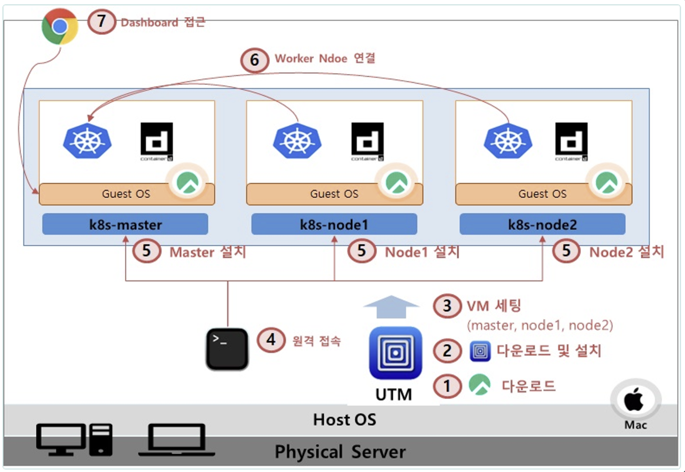 쿠버네티스를 설치하는 과정에서 UTM은 MacOS에서 리눅스 환경을 제공하기 위해 사용되며, 이를 통해 Mac에서 쿠버네티스를 설치하고 클러스터를 운영할 수 있다.