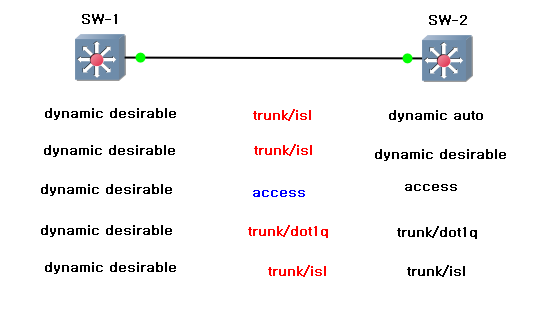 DTP 비활성활 : SW2(config-if)#switchport nonegotiate
