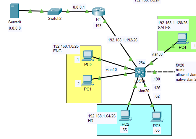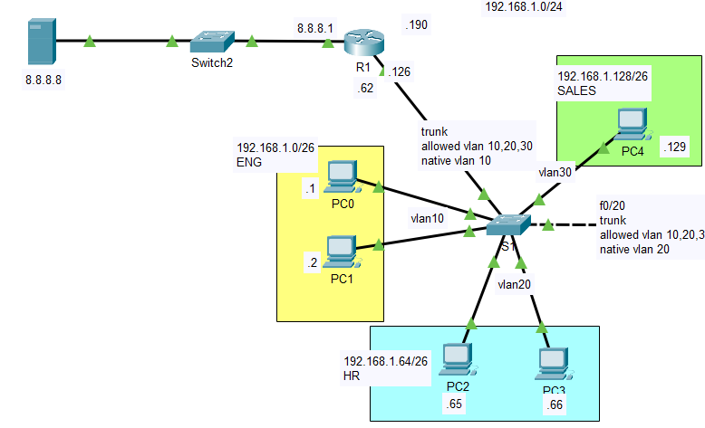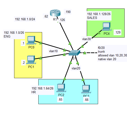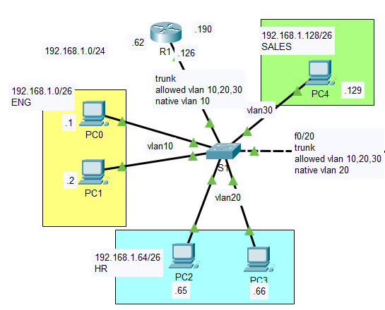 R1(config-subif)#ip add 192.168.1.62 255.255.255.192R1(config-subif)#int g0/0.20