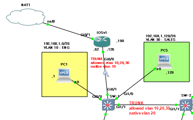 R1(config-subif)#ip add 192.168.1.126 255.255.255.192R1(config-subif)#int g0/0.30