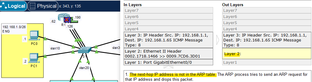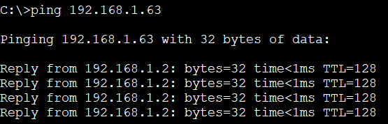 PC0>ping 192.168.1.63 -> ping 성공 PC1(같은 네트워크 영역)에서 ICMP retrun을 받은 것