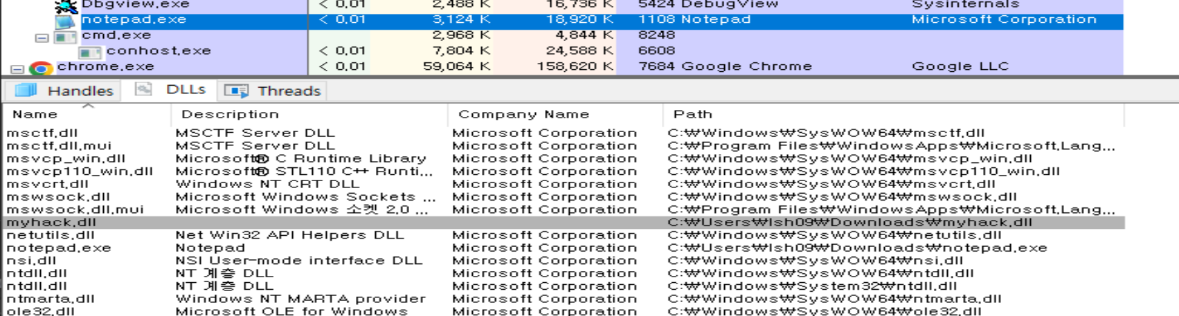 확인해보면 DLL이 인젝션 된 것을 확인 할 수 있다.