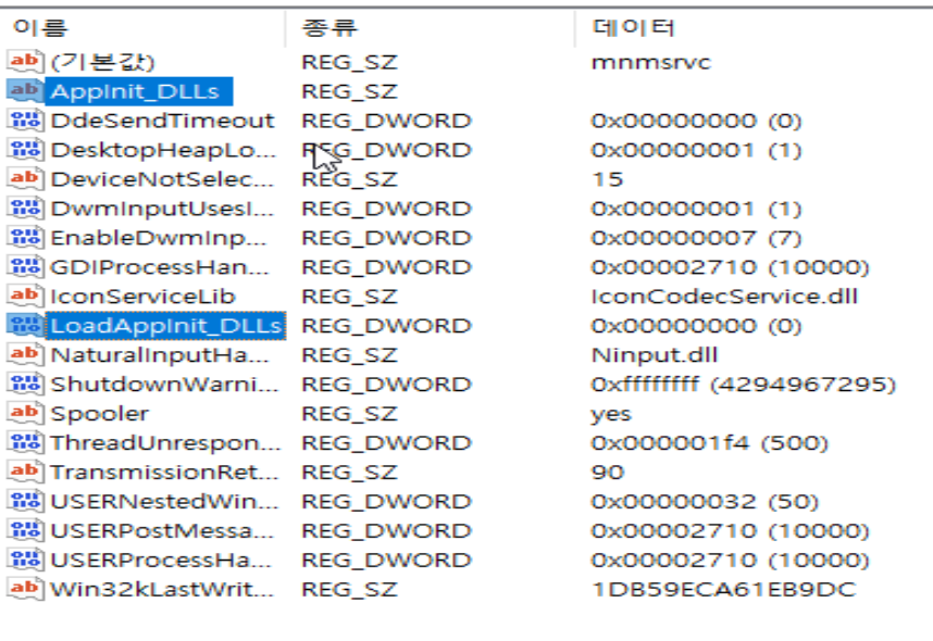 AppInit_DLLs에 인젝션을 원하는 DLL 경로의 문자열을 쓰고 LoadAppInit_DLLs의 항목 값을 1로 변경한 후 재부팅하면 모든 프로세스에 해당 DLL을 인젝션한다. 이 방법은 user32.dll이 프로세스에 로딩될 때 가능한 방법으로 user32.dll을 로딩하는 프로세스에만 해당된다.