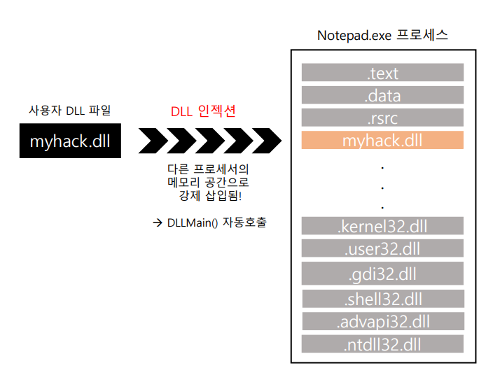 = 다른 프로세스에 LoadLibrary() API를 스스로 호출하도록 명령하여 원하는 DLL을 로딩하도록 하는 것