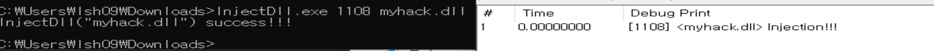 InjectDll을 이용해서 myhack.dll을 인젝션하고 DebugView로 확인해 보았다. DebugView에 나온 1108은 notepad.exe의 PID이다. 성공적으로 되었음을 확인 할 수 있다. 이 말은 즉, DllMain() 함수의 OutputDebugString() API가 호출된 것이다.