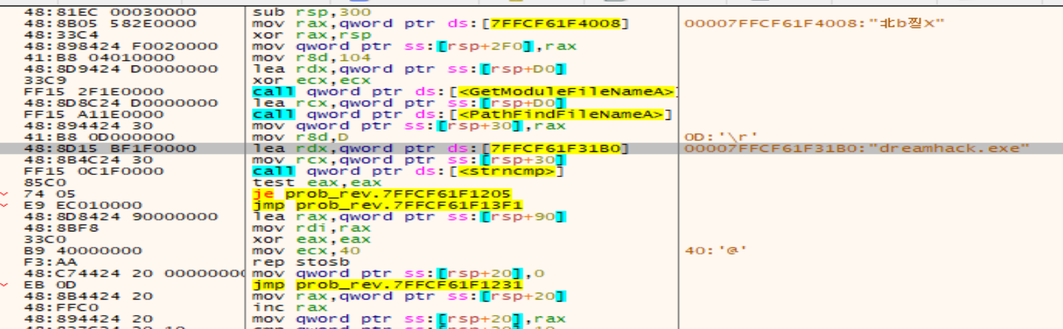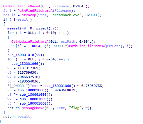 이렇게 보니까 확실히 디컴파일링 기능이 좋다는 생각이 들었다. Path의 FileName이 일단 dreamhack.exe가 되어야 한다는 것이고 그 실행파일과 같은 경로에 prob_rev.dll이 있으면 어려운 코드 계산에 상관없이 MessageBoxA 함수로 flag를 출력할 것이라고 생각했다.