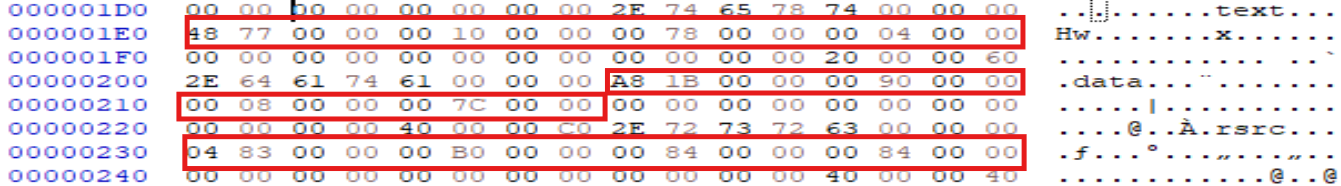 1. 각각 빨간색의 박스들이 해당 섹션의 VirtualSize,RVA,SizeOfRawData,PointerToRawData의 값을 가지고 있다. 이를 통해 파일과 메모리에서의 섹션 할당 주소와 크기를 알 수 있다.
