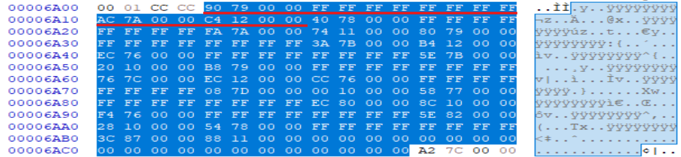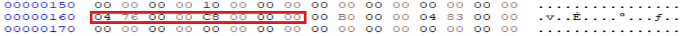 해당 주소로 가면 여기서 부터 IAT의 구조체 배열이 C8만큼 되어 있다. 여기서 빨간색 밑줄이 첫번째 구조체 배열의 원소로. 각각은 RVA 주소로 되어있다. 해당 RVA로 RAW를 구해서 보면 원하는 멤버 변수의 값들이 들어있음을 알 수 있다.