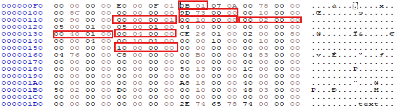 4. SectiongAlignment, FileAlignment : 각각 00000100, 00000200의 값을 가지고 있고, 이를 통해 파일/메모리의 섹션 크기는 반드시 SectionAlignment와 FileAlignment의 배수로 크기를 가져야 한다.