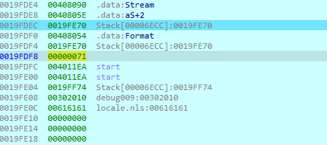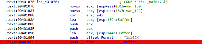 sprintf 함수에 4가지 파라미터가 들어가는데 스택에 역순으로 저장되는 것을 알고 있으니, 중요한 부분의 값만 읽으면 되겠다고 생각할 수 있다. 그곳이 "v8[v3++] ^ v7[i-1]"이고 이는 4번째 파라미터이므로 첫번째로 push되었을 것이다. 이부분의 stack register를 보면 다음과 같다.