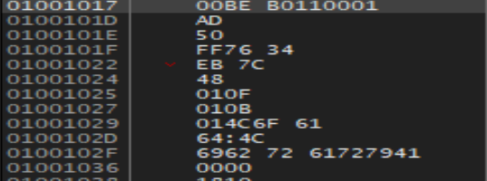 근데 이곳을 보니 뭔가 이상하다. 코드가 아니라 LoadLibraryA 문자열 영역이다.