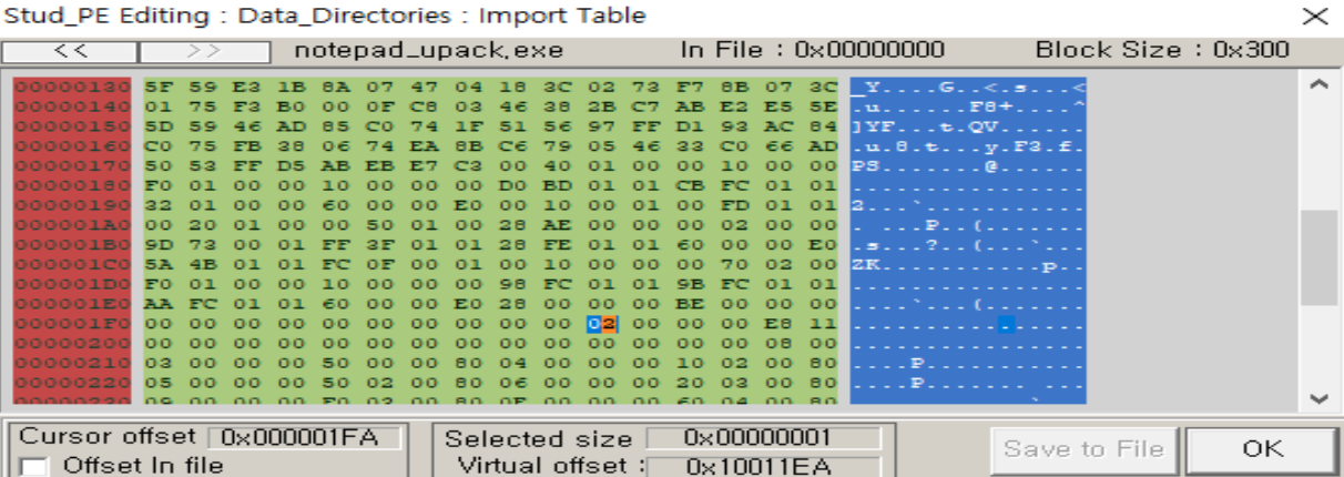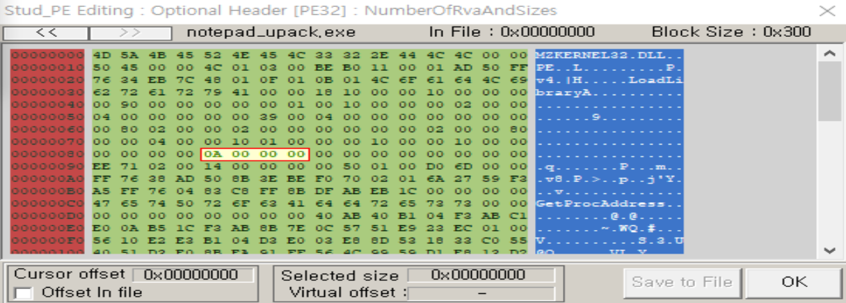 1. NumberOfRvaAndSizes : 정상적인 IMAGE_DATA_DIRECTORY 배열의 원소는 10h개이지만, UPack에서는 A개로 변경된다. 즉 인덱스 9 이후의 구조체 배열의 원소들은 무시한다. 그리고 그 영역을 자신의 코드로 덮어버린다.