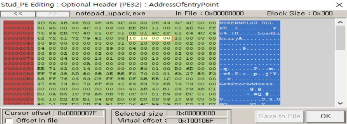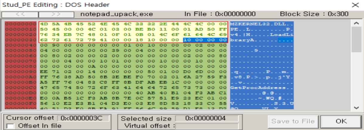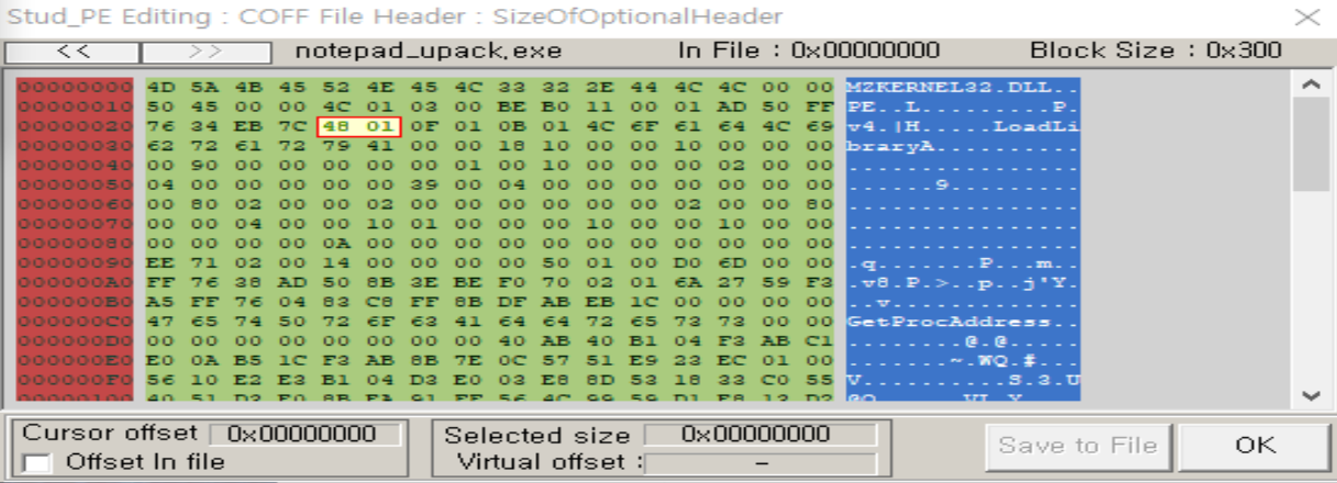 1. SizeOfOptionalHeader : 원래 IMAGE_OPTINONAL_HEADER 구조체의 크기는 E0인데 UPack은 이 값을 148h로 변경한다. \