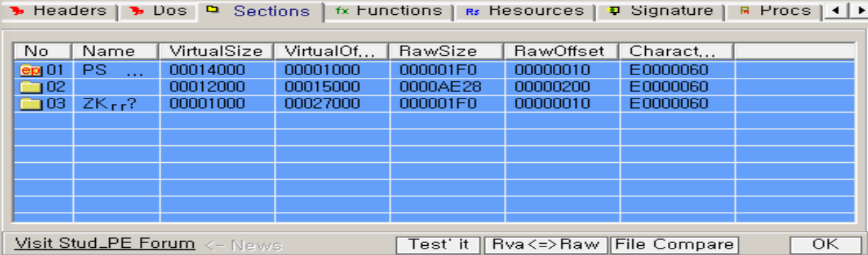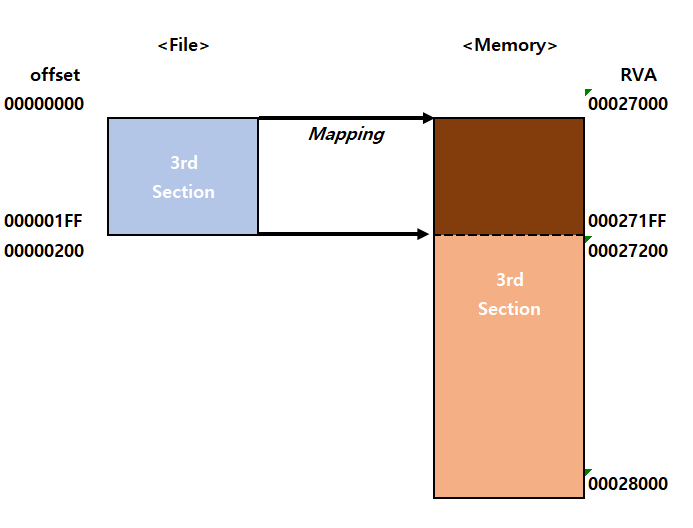 세번째 섹션의 크기 및 offset은 첫번째 섹션과 같았고 이 만큼의 공간을 메모리에 할당한다. 나머지는 NULL로 다 채운다. 이는 PE 스펙을 어긋나지 않은 활동이다.
