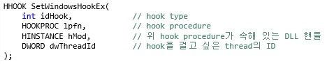 여기서 hook procedure란 운영체제가 호출하는 콜백 함수이며, DLL 내부에 존재해야 한다. 이 API를 이용하여 훅을 설치하면 메세지가 발생했을 때, 운영체제가 DLL 파일을 프로세스에 강제로 인젝션하고 등록된 hook procedure를 호출한다. 이것이 훗날 DLL Injection인 것 같다.
