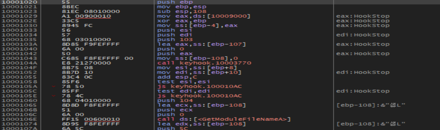 KeyHook.dll 파일을 로딩한 후 Hookstart와 HookStop 함수의 주소를 얻어 후킹 진행