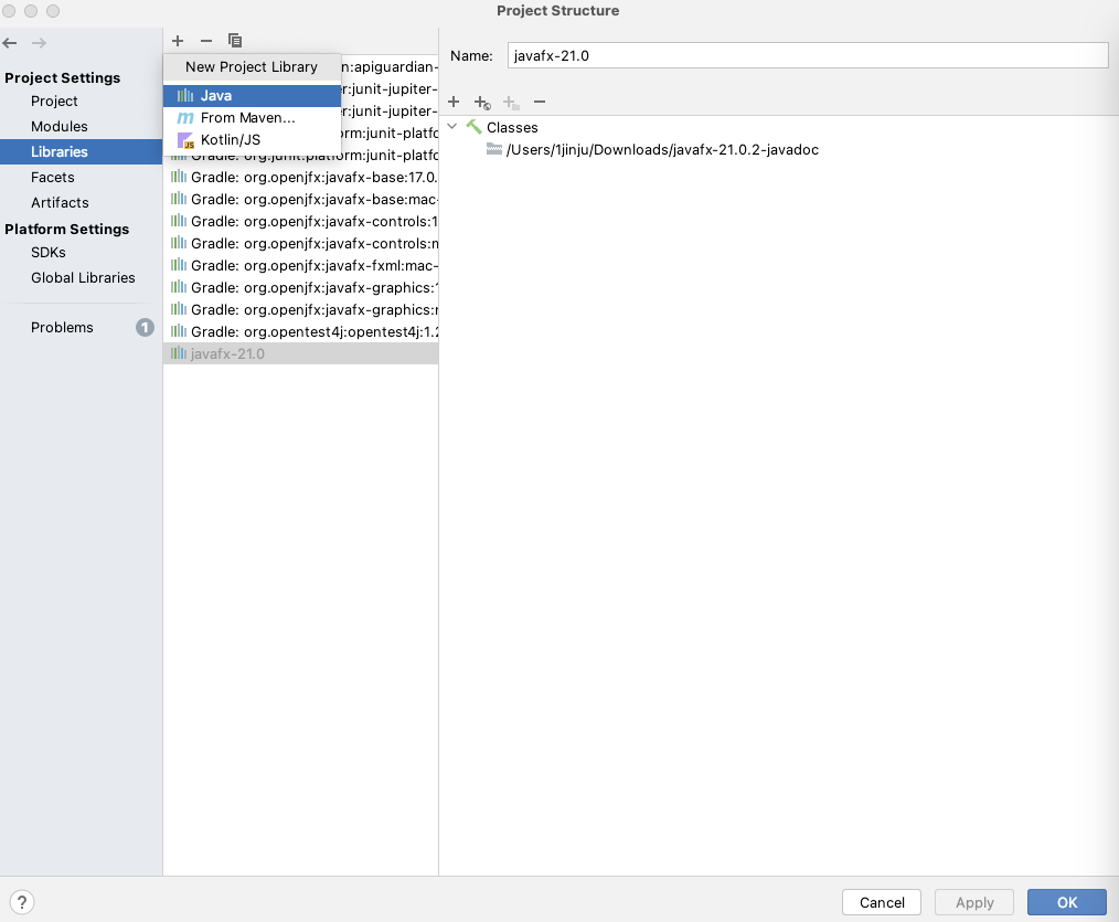 File -> Project Structure -> Libraries에서 + 버튼을 누르면 위와 같은 화면이 나타납니다.