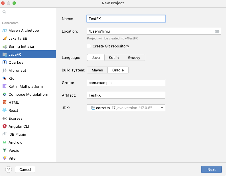 이름은 TestFX로, Build system은 Gradle을 선택해주었습니다.