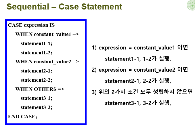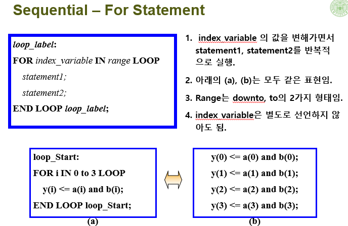 다른 프로그래밍 언어의 for문과 비슷하나, range가 다름. Range는 downto와 to의 형태를 가질 수 있으며, index_variable에 range를 할당한 순서대로 들어감.